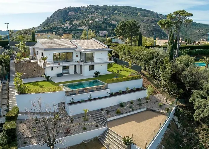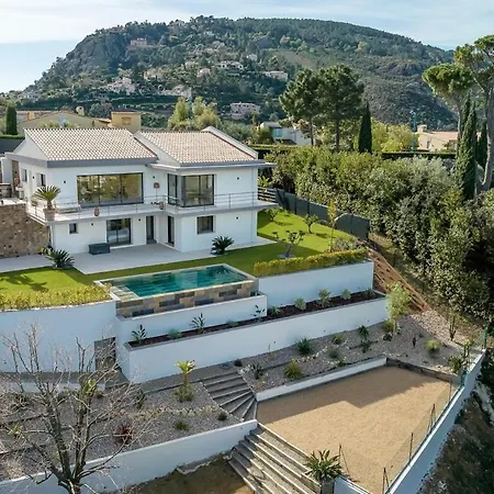 Villa Skyfall La Napoule提供住宿,设有私人游泳池和设施齐全的厨房。